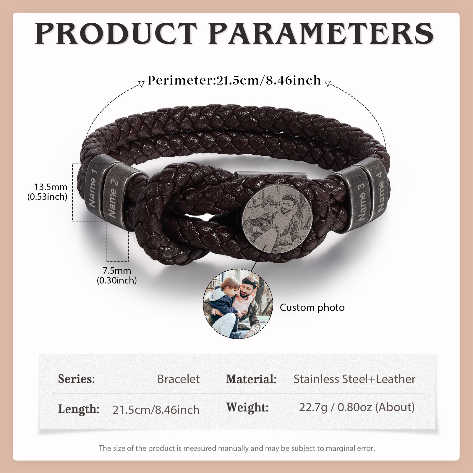 Pulsera personalizada de cuero trenzado con 4 nombres y una foto